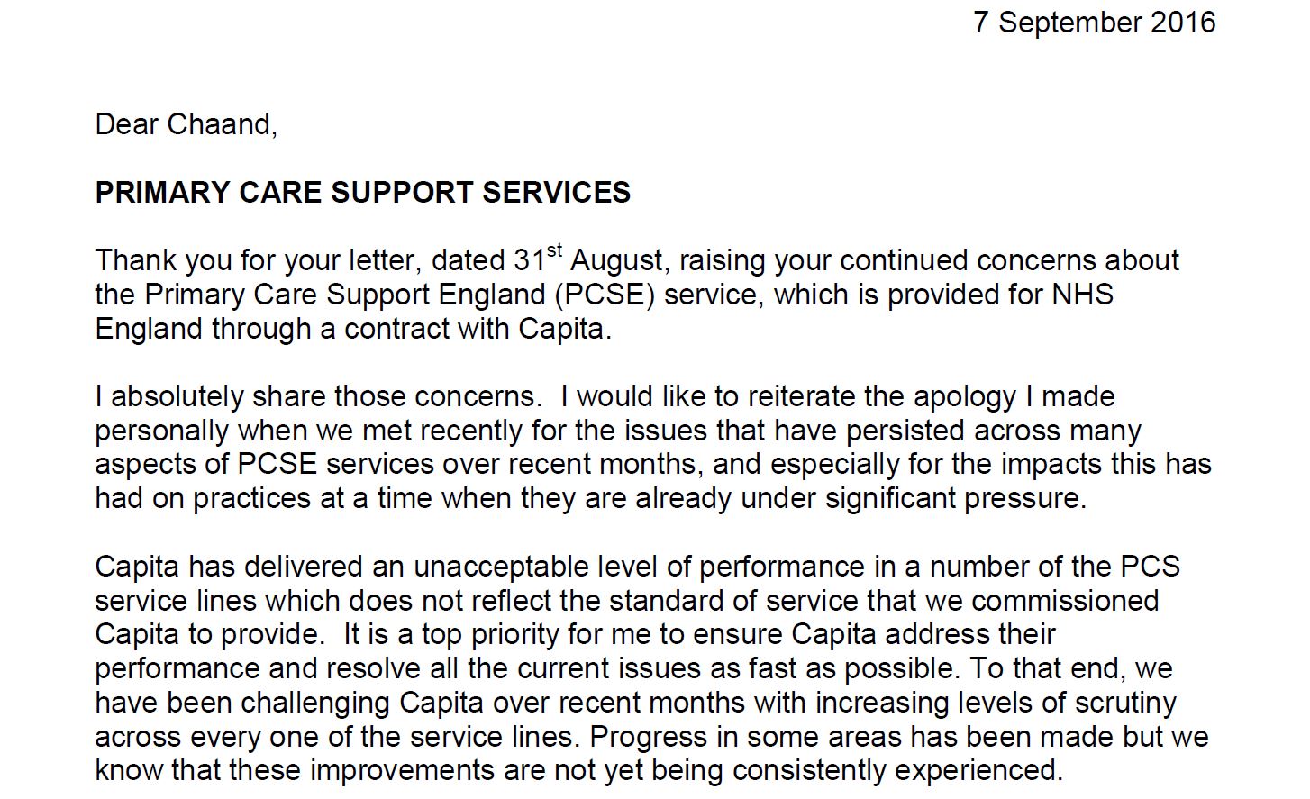 NHS England’s national director for transformation and corporate operations, Karen Wheeler, has issued an apology for the ‘unacceptable level of performance’ from Capita in the letter to the British Medical Association’s General Practitioners Committee chairman Dr Chaand Nagpaul.