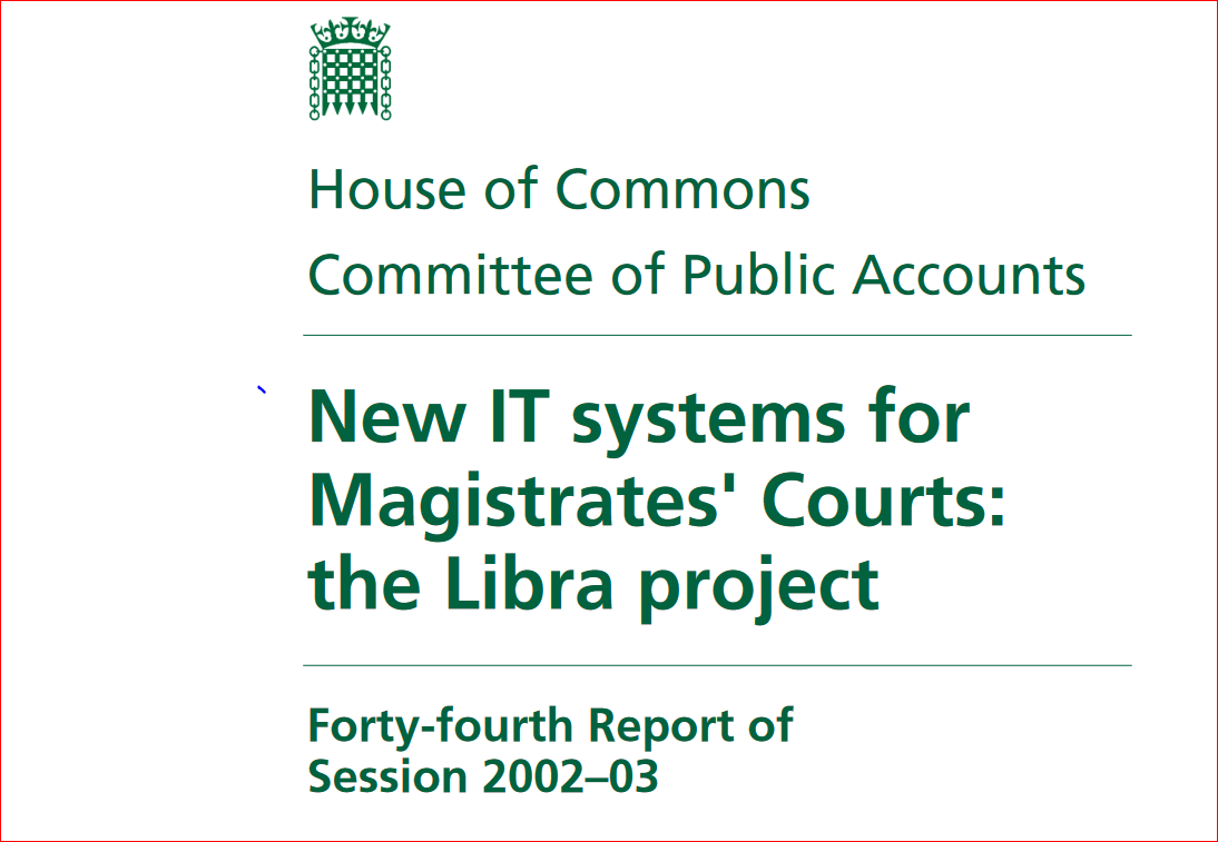 Instead, the report contained a foreword by then Lord Chancellor which used the future tense when referring to Libra. [It’s commonplace when things go wrong on major IT-related projects that Whitehall reports on what will be achieved, which avoids explaining the failures to date – a variation on the “conceal-and-deny” theme.]