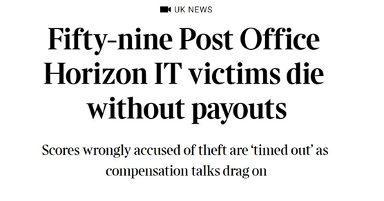 8) The government-owned Post Office spent £600m on a flawed computer system, Horizon, whose defects led to hundreds of sub-postmasters and sub-postmistresses losing their homes, businesses and, in a few cases, their lives, while more than 700 miscarriages of justice have left taxpayers facing a £1bn compensation bill, a potential debt that leaves the Post Office technically insolvent;