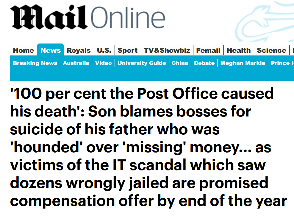 Former postal workers went to prison for theft when the Post Office knew they hadn’t stolen anything. The Post Office also forced some into bankruptcy and confiscated their homes. Sub-postmasters parted with personal possessions such as wedding and engagement rings to pay phantom debts. The Post Office removed sub-postmasters’ livelihoods rather than own up to Horizon’s faults. Postal workers were pressured to confess they had stolen money when they knew they had stolen nothing: they hoped their made-up confessions would keep them out of jail – but some still went to jail anyway. Marriages broke up. Many sub-postmasters suffered health problems. More than 60 died without compensation. Some committed suicide.