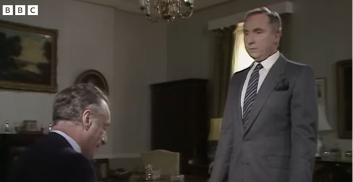 Sir Humphrey, permanent secretary at the fictional Department for Administrative Affairs, and his minister Jim Hacker, discuss (below) the Post Office IT scandal.