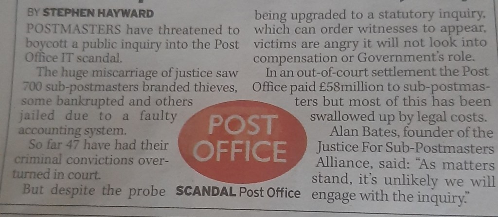 The expression “right thing to do” was odd in the context of a scandal in which the government refuses to pay a penny in compensation to hundreds of sub-postmasters who were not convicted but still lost homes and businesses on the basis of Horizon “evidence”. Some including Lee Castleton lost, directly, hundreds of thousands of pounds. Many former sub-postmasters and sub-mistresses have not received full refunds of money they were made to pay for Horizon losses.
