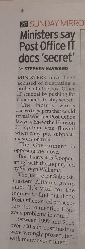 The Sunday Mirror reported yesterday that the government opposes a move by the inquiry to see documents that could reveal whether the Post Office’s lawyers knew of Horizon’s flaws when they put sub-postmasters on trial.