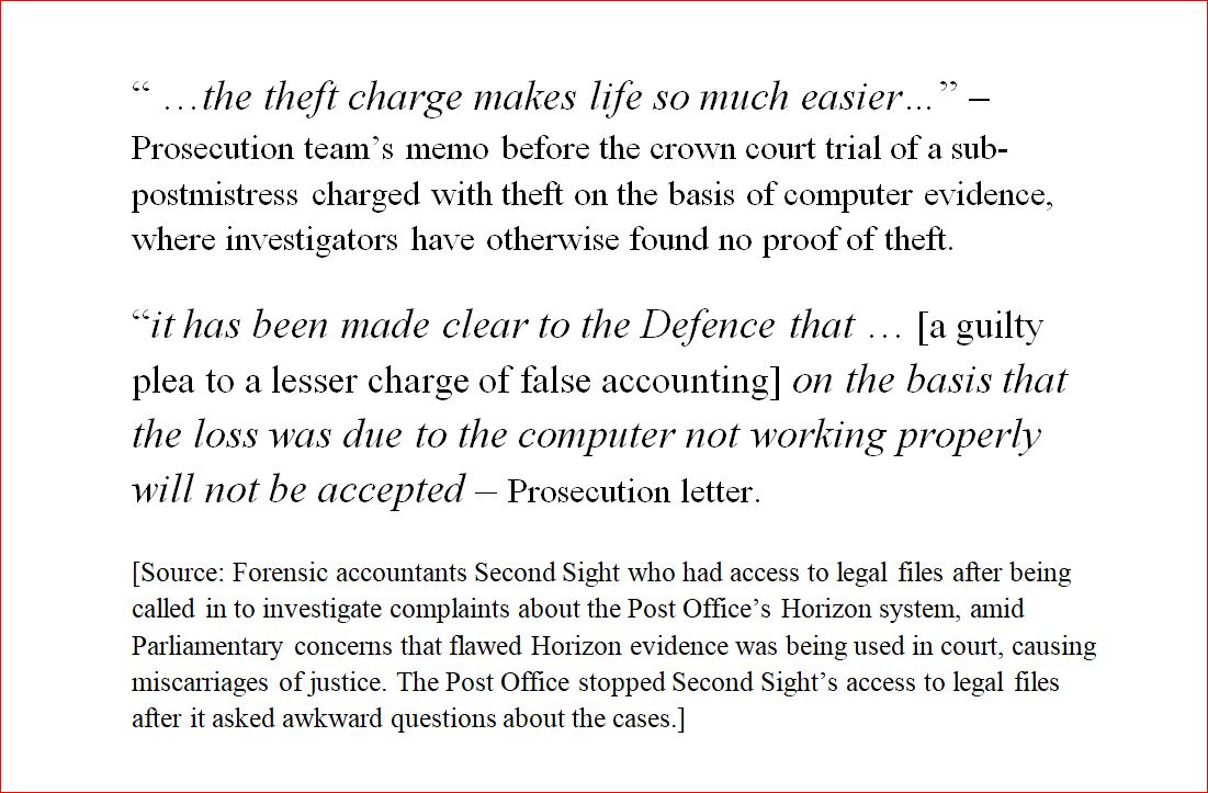 Innumerable Horizon-based prosecutions suspect. Prosecutions and convictions were based on an assumption by the courts and juries that the accused was responsible for the Horizon-based branch post office data in question. But the High Court judge found last year that all software specialists at Fujitsu’s Software Support Centre at Bracknell had powerful “APPSUP” system privileges that enabled them to do almost anything on the Horizon database, including “injecting” transactions into a branch post office’s accounts without the knowledge of sub-postmaster. Some Fujitsu personnel had APPSUP access privileges they were not supposed to have. They were able to edit the branch accounts, add “balancing transactions” or delete transactions. Sometimes alterations could take place live without the sub-postmasters’ realising or having given their consent. Fujitsu specialists were able at one time to use a sub-postmasters’ ID number which could leave sub-postmasters believing they had made the changes carried out by Fujitsu. The judge found there was a lack of control of the role and the recording of access. Logs were maintained between 2009 to July 2015 but did not record actions, only whether a user had logged on and logged off. Even after July 2015, the logs “are not a useful source of evidence about remote access”, due to their lack of content, said the judge.